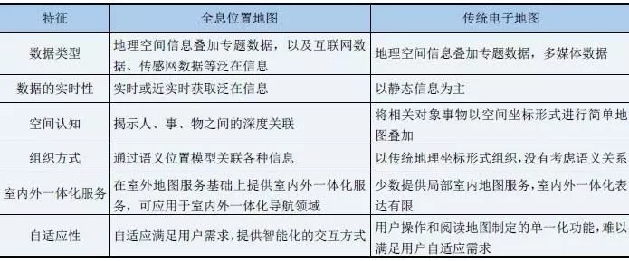 通過對全息位置地圖概念的理解,并與現(xiàn)有電子地圖比較分析(表1),歸納了全息位置地圖實(shí)時(shí)動(dòng)態(tài)性、語義位置關(guān)聯(lián)、室內(nèi)外一體化、自適應(yīng)性和多維時(shí)空表達(dá)的五大特征。