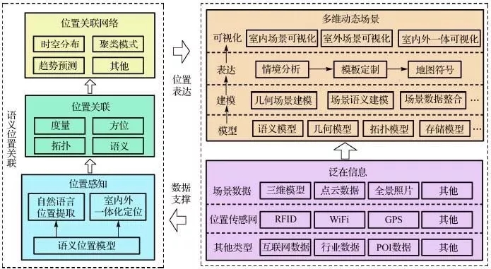 其中,語義位置關(guān)聯(lián)以語義位置模型(黃亮,2014)為基礎(chǔ),動(dòng)態(tài)感知泛在信息中存在的位置信息,并基于度量、方位、拓?fù)浜驼Z義等簡單的位置關(guān)聯(lián)和通過時(shí)空分布、聚類模型和趨勢預(yù)測等方法形成深層次的位置關(guān)聯(lián)網(wǎng)絡(luò),實(shí)現(xiàn)全方位的語義位置關(guān)聯(lián)。多維動(dòng)態(tài)場景的技術(shù)框架則分別從場景模型、建模、表達(dá)與可視化幾個(gè)方面構(gòu)建。