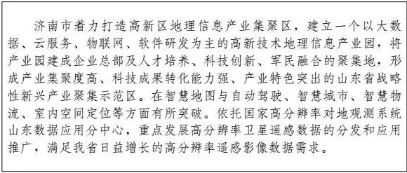 13.建設(shè)3個產(chǎn)業(yè)集聚區(qū)。鼓勵支持濟南市用好新舊動能轉(zhuǎn)換先行區(qū)平臺,打造地理信息全產(chǎn)業(yè)鏈集聚融合發(fā)展新高地。