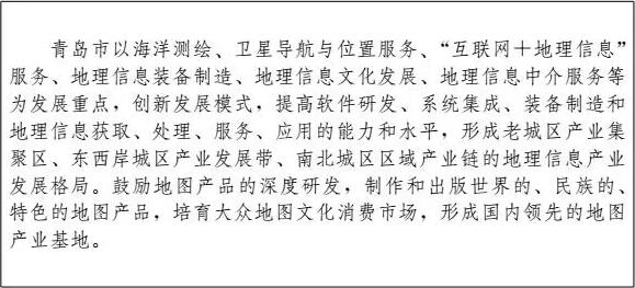 鼓勵支持青島市以地理信息產(chǎn)業(yè)園和地圖文化與創(chuàng)意國家測繪地理信息局工程技術(shù)研究中心為基礎(chǔ),建設(shè)以海洋地理信息服務(wù)和地圖產(chǎn)業(yè)為特色的集聚區(qū)。