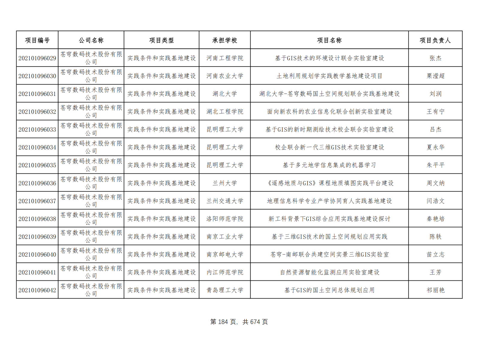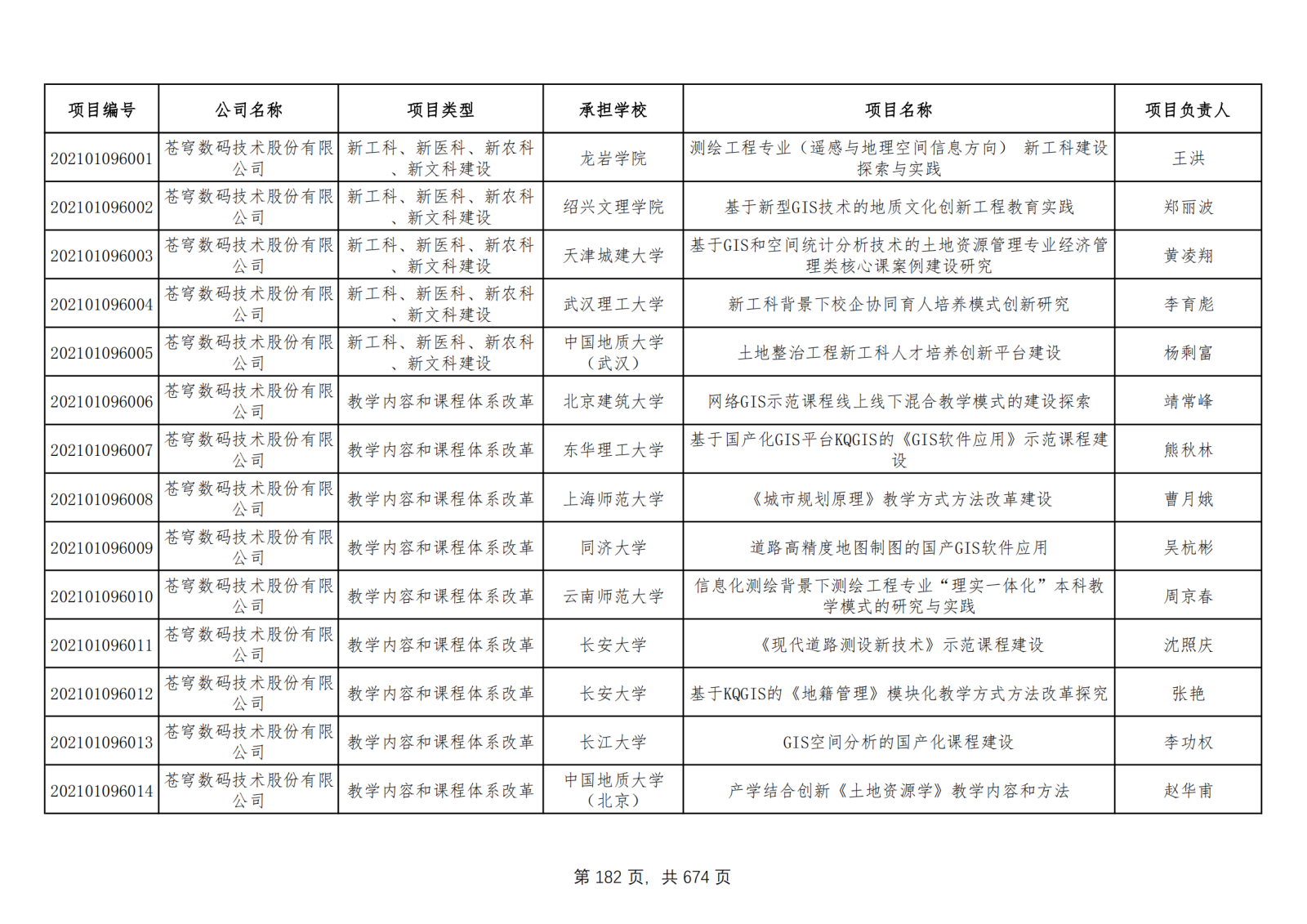 根據(jù)此次對外公示的名單可知,2021年第一批蒼穹數(shù)碼獲批產(chǎn)學(xué)合作協(xié)同育人立項項目共計63個,主要涉及“新工科、新醫(yī)科、新農(nóng)科、新文科建設(shè),教學(xué)內(nèi)容和課程體系改革,實踐條件和實踐基地建設(shè)”等3大項目類型,并分屬同濟大學(xué)、長安大學(xué)、湖北大學(xué)、中國地質(zhì)大學(xué)、中國農(nóng)業(yè)大學(xué)等眾多知名高校。