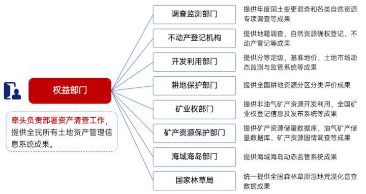 《工作方案》指出:本次資產(chǎn)清查基準(zhǔn)時點為2023年12月31日。資產(chǎn)清查工作將按照“國家統(tǒng)一部署,省負(fù)總責(zé),市縣抓落實”的模式開展,各?。▍^(qū)、市)也可結(jié)合資源稟賦、工作基礎(chǔ)、財力保障水平等,由省級統(tǒng)籌實施。資產(chǎn)清查工作由權(quán)益部門牽頭負(fù)責(zé),調(diào)查監(jiān)測、不動產(chǎn)登記、開發(fā)利用、耕地保護(hù)、礦業(yè)權(quán)、礦產(chǎn)資源保護(hù)、海域海島和國家林草局等部門提供各類自然資源資產(chǎn)數(shù)據(jù)、系統(tǒng)成果。