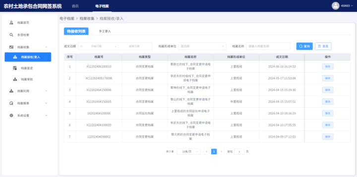 系統(tǒng)契合《第二輪土地承包到期后再延長30年試點工作檔案管理辦法》,能夠根據(jù)二輪延包農(nóng)戶自動建立檔案文件目錄,無縫對接二輪延包業(yè)務(wù)審批系統(tǒng),自動接收并檢查承包方延包申請、地塊調(diào)查信息、土地承包合同等關(guān)鍵信息。確保承包方農(nóng)戶“一戶一檔”,同時根據(jù)實際需要補(bǔ)錄線下檔案文件信息,保證檔案資料的完整性與準(zhǔn)確性。