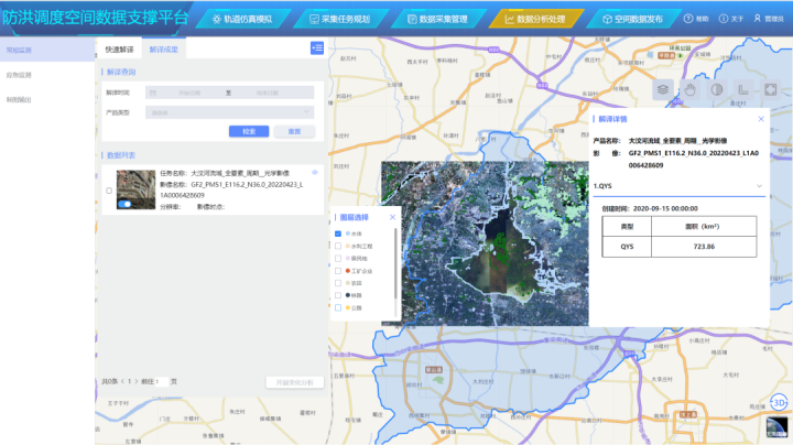 蒼穹數(shù)碼主導(dǎo)開發(fā)的防洪重點保護(hù)對象動態(tài)監(jiān)測模塊通過遙感技術(shù)監(jiān)測大汶河以及沂沭河流域內(nèi)的防洪重點保護(hù)對象,界定重點保護(hù)對象范圍,采用遙感影像信息提取技術(shù)或者基于采購的高時效性數(shù)據(jù)產(chǎn)品的方式,提取受洪水威脅的居民地、骨干交通(重要鐵路及公路干線)、工礦企業(yè)(大型骨干企業(yè)和工礦區(qū))、重要水利工程、農(nóng)田等作為防洪重點保護(hù)對象的空間范圍。