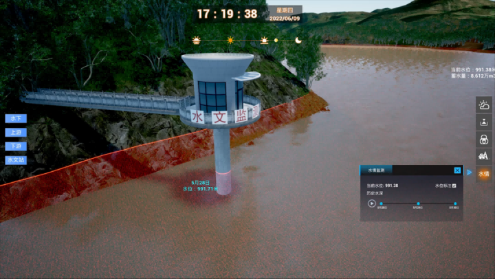 采用動態(tài)渲染技術(shù),模擬仿真閘門啟閉、泄水、流量變化過程。與閘門自動控制系統(tǒng)對接,遠(yuǎn)程控制閘門啟閉,達(dá)到水利工程運行的虛實交互。