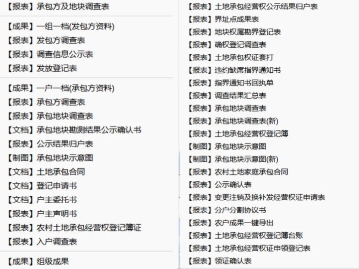 軟件可以按照國家、省市級(jí)數(shù)據(jù)標(biāo)準(zhǔn)要求,導(dǎo)出承包方調(diào)查表、發(fā)包方調(diào)查表、公示結(jié)果歸戶表、土地承包經(jīng)營權(quán)證套打、調(diào)查信息公示表、土地承包合同、農(nóng)村土地承包經(jīng)營權(quán)證登記簿、承包地塊調(diào)查表等國標(biāo)報(bào)表。