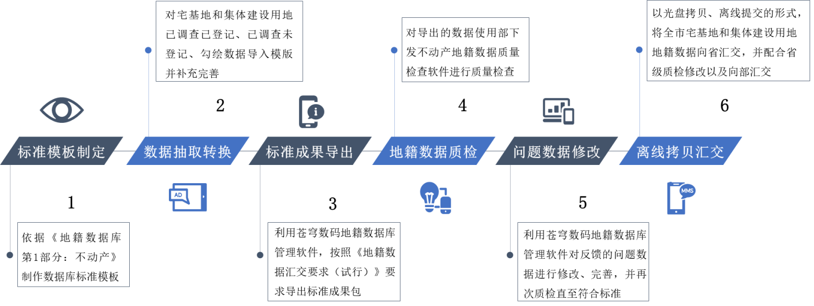 蒼穹數(shù)碼充分發(fā)揮在數(shù)據(jù)治理和質(zhì)檢匯交領(lǐng)域的深厚累積,針對黃山地籍數(shù)據(jù)庫“物理分散、邏輯集中”的管理現(xiàn)狀,快速制定了“標準模板制定—數(shù)據(jù)抽取轉(zhuǎn)換—標準成果導(dǎo)出—地籍數(shù)據(jù)質(zhì)檢—問題數(shù)據(jù)修改—離線拷貝匯交”的整體技術(shù)路線。在以國家下發(fā)的“不動產(chǎn)地籍數(shù)據(jù)質(zhì)量檢查軟件”為質(zhì)量管控標準的基礎(chǔ)上,依托全國產(chǎn)自主研發(fā)的地籍數(shù)據(jù)庫管理軟件,對數(shù)據(jù)修改完善后一鍵式快捷導(dǎo)出標準成果包,確保每一項數(shù)據(jù)“查得準、改得對、匯得全”。
